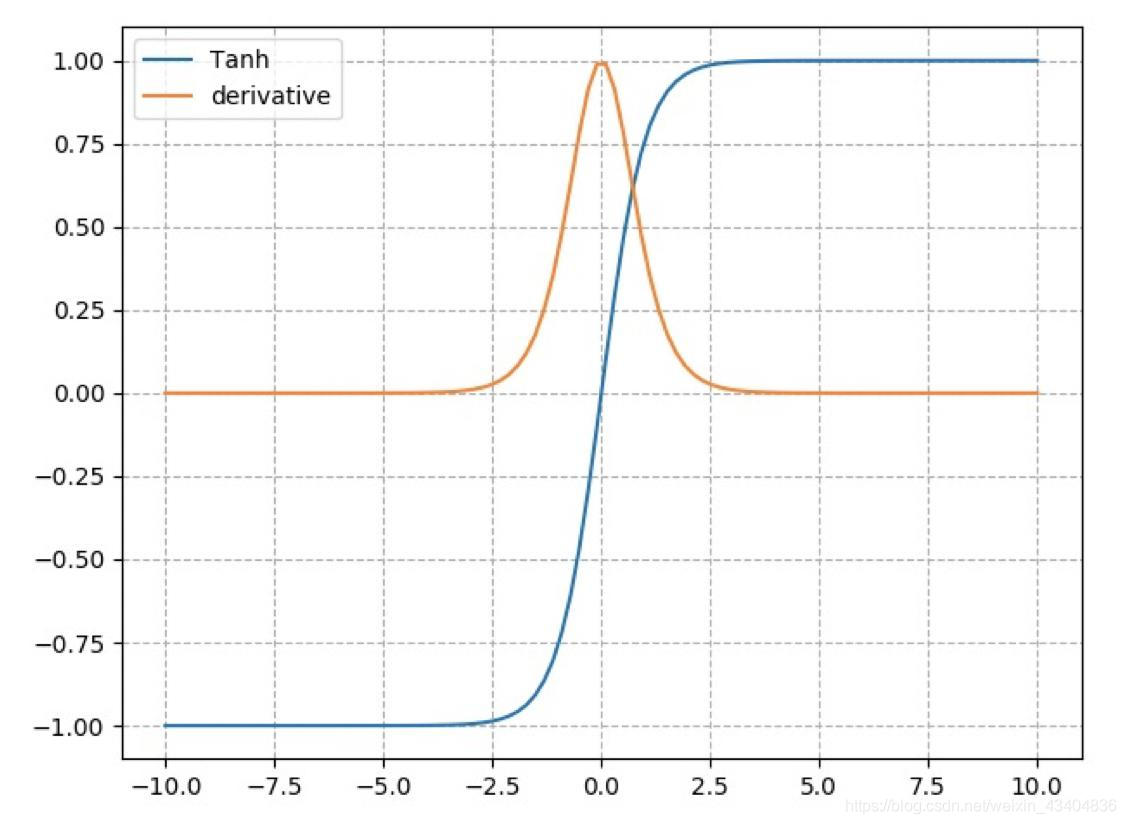g′(x)=g(x)?(1?g(x))  特点: 简单,导函数两边存在饱和区(趋近于0),梯度几乎是零,会导致网络训练比较困难,导数中间部分趋近线性,称为线性区。 值域:(0,1) - (2) Tanh函数(双曲正切):