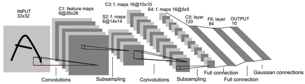 https://www.cs.ryerson.ca/~aharley/vis/conv/ 不多说了,上面就是这个可视化工具的网址。这个可视化工具的CNN框架是LeNet-5。 来,我们看一下LeNet-5的网络结构。正好啊,这个网络的输入是单通道灰度图为例的。