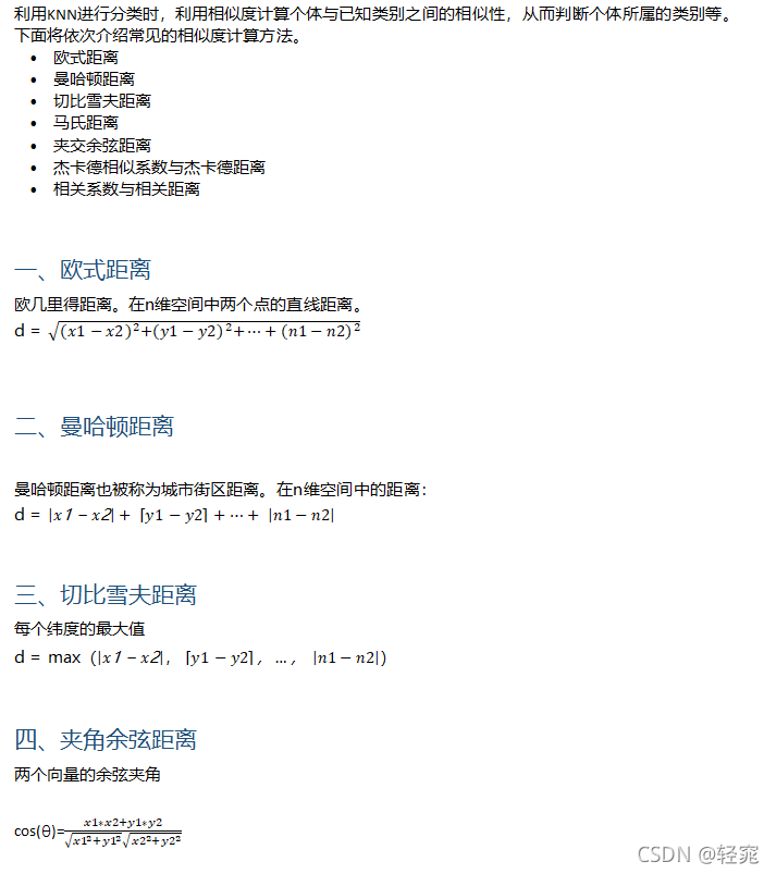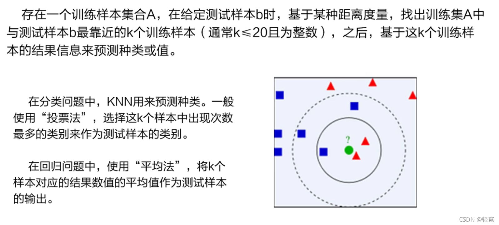1.计算测试样本与训练集中所有样本之间的相似度(使用距离表征相似度.) 2.按照距离递增排序 3.选择与测试样本中距离最近的k个训练样本. 4.根据选择出的K个样本的标签,进行投票或平均 (投票为分类问题,求平均为回归问题).