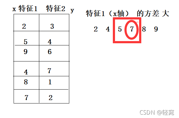 1、对于一个只有两个特征x和y的训练集,比较两列的特征的方差,方差最大的作为第一个考虑对象,将其从小到大排列,选出中位数(注意:此处的中位数必须是一个固定的值,也就是说当有两个中位数时,不需要求他们的均值,只需要任选一个),选出中位数所在的(x,y)作为根节点(比如方差最大的是x列,根节点的子节点将考虑y列的中位数,子节点的子节点再考虑x,以此类推)