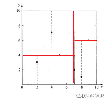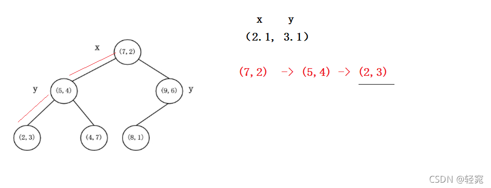 1、比如给定一组特征(2.1,3.1),由于我们上面的kd树的根节点是先根据x判断的,所以先判断2.1和7的大小,很显然比7小放到根节点的左边 2、根节点的子节点是根据y来判断的,所以比较3.1和4的大小,比4小放到左边 3、进行回溯(如下图所示:红线为中位数),先从路径中取出(2,3)点作为最近邻点,计算到查询点的距离,dis=0.1414。再回溯到父节点(5,4),以(2.1,3.1)为圆心,dis为半径画圆,发现并不与y=4相交,也就是说没有大于四与(2.1,3.1)更临近,所以(5,4)的右子树就不再考虑