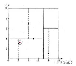 4、继续向上回溯到根节点,同理以(2.1,3.1)为圆心,dis为半径画圆,更不会与x=7相交,所以不考虑(7,2)的右子树 5、得出结论,与(2.1,3.1)最近邻的点是(2,3) 如下图所示:在此kd树中只进行了三次运算,如果使用暴力搜索则会进行六次运算,比暴力搜索快