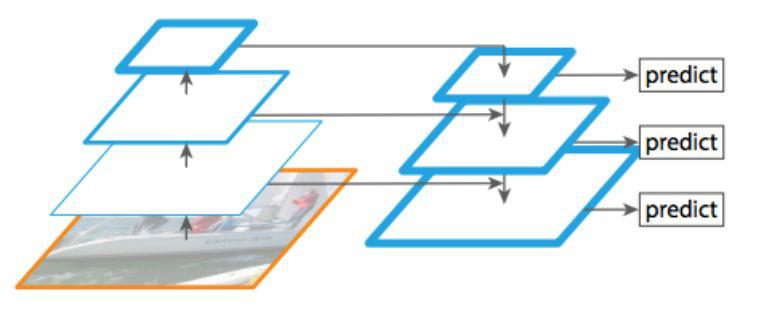 特征金字塔网络主要用于提取特征。通常的卷积网络是不断地堆叠卷积层然后利用最后一个卷积层的输出来进行分类等操作,而这种方法对于要识别图像中的小目标来说效果不是很好。为了解决这个问题使用特征金字塔网络,它在传统的卷积上多了一步上采样,将卷积的结果进行上采样,上采样的次数与卷积的次数相对应。大致示意如下图:  特征金字塔网络示意