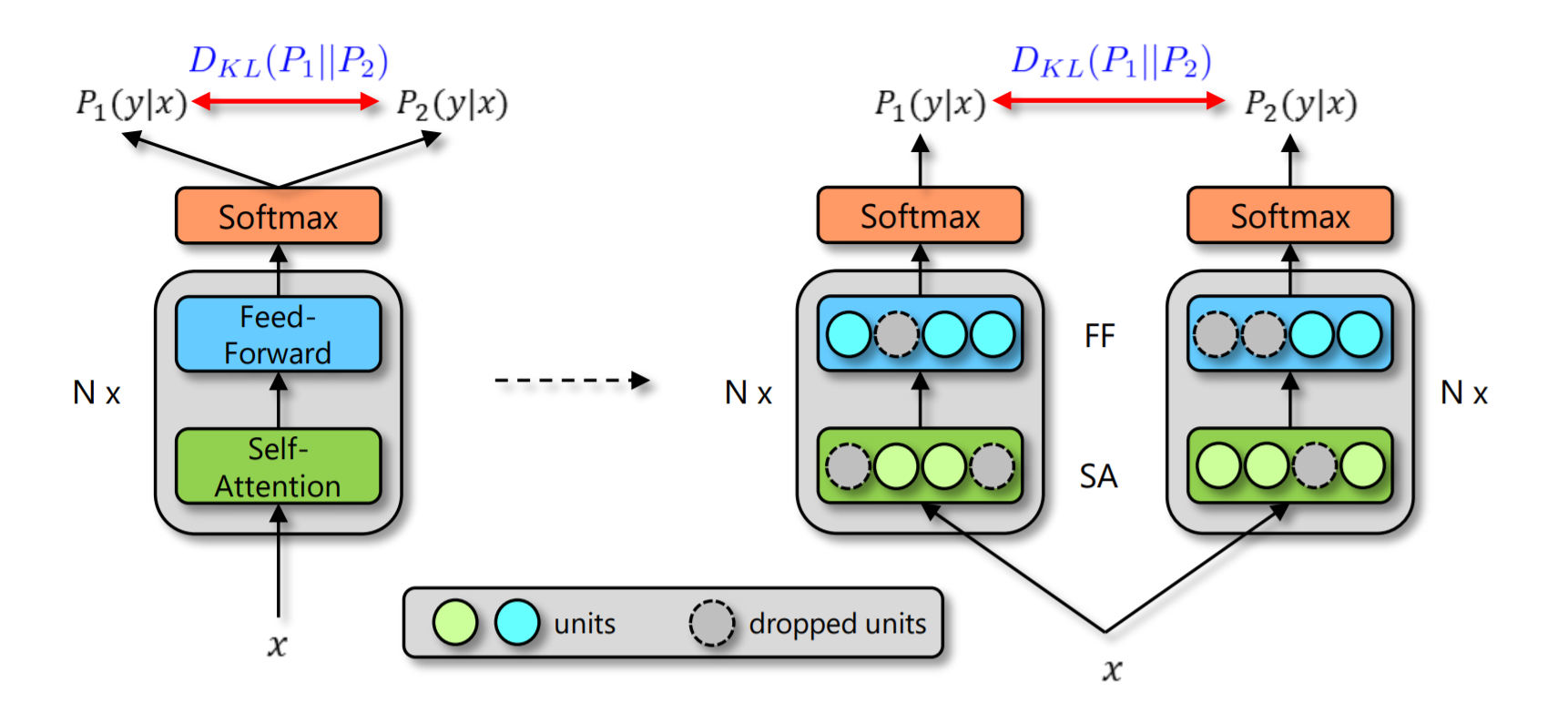 论文提出的是上图中右侧模型。如图所示,同一数据经过了两次模型,使用了随机dropout后得到了两个不同的子模型,图中