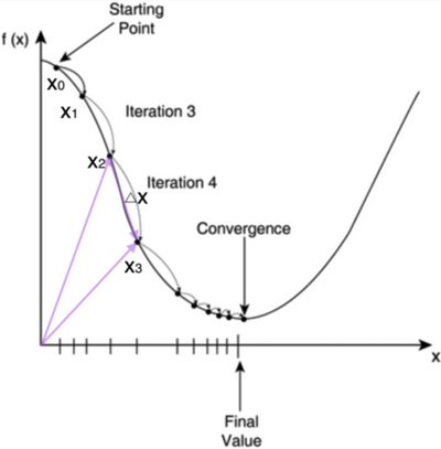 借用物理中速度与距离(路程)的关系来思考这个问题,横轴是时间轴T,纵轴是距离L,设速度为V,故L=VT,L的梯度(关于T的一阶导数)L’ = V,即当前时刻t的速度。因为当前求得速度是沿该方向移动最远的最大正向速度,而目标是最小化——求最短距离,所以需要取相反的方向。 学习率的大小取值为( 0 , 1 ],相当于对单位时间(1秒)进行缩小( 以防止跨过了最优值的位置 )。 综上所述,学习率乘梯度等于单位时间乘以速度得到路程(在此处的环境中),其中单位时间因学习率(缩小因子)进行了范围缩小,路程是旧节点到新节点的距离(上图 iteration4所示)。同时这也就是学习率为什么也叫步长的原因。