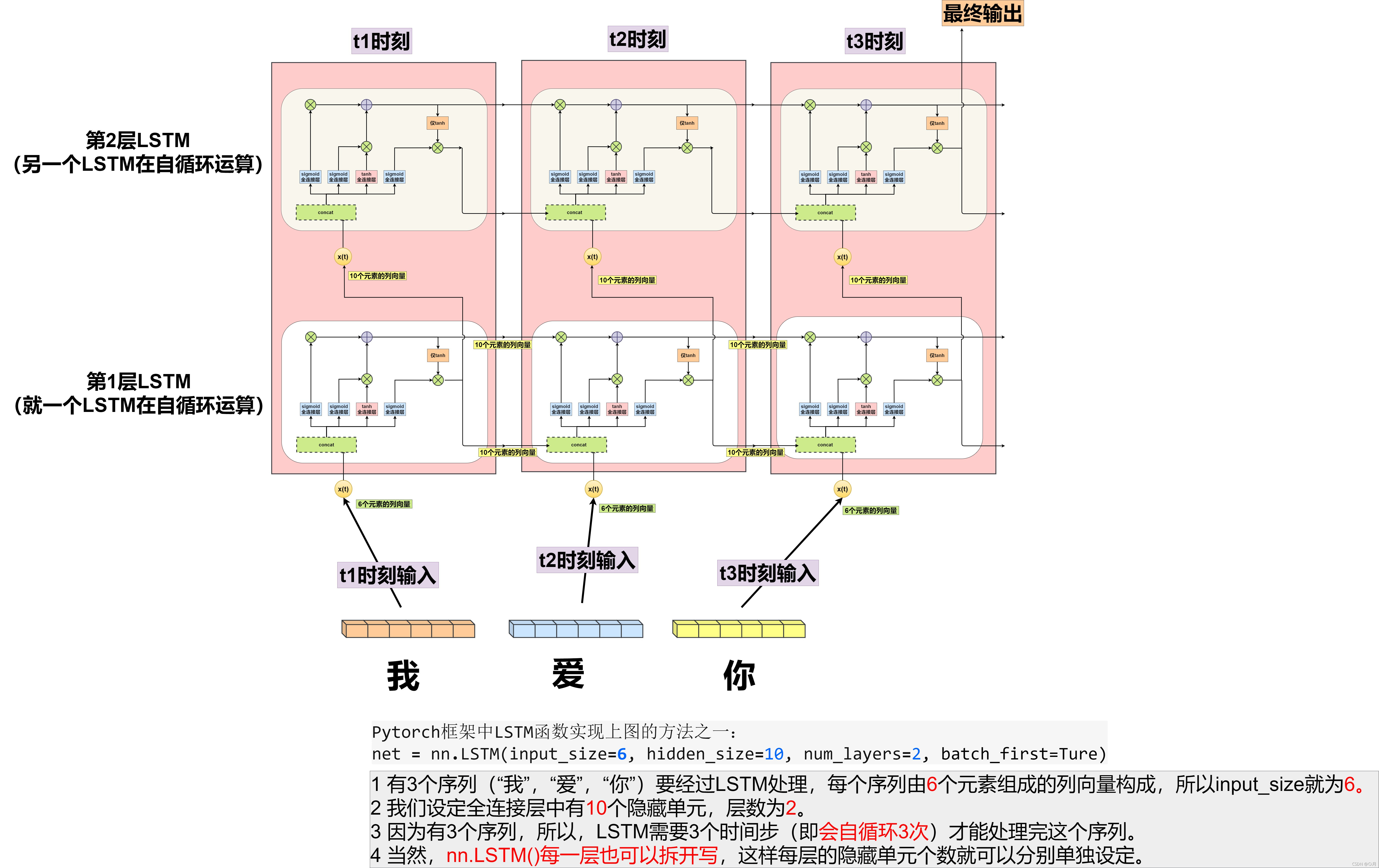 - 特别注意:所有时间步计算完后,才算是LSTM的结果,如下图,正向LSTM经过6个时间步得到一个结果向量,反向LSTM同样经过6个时间步后,得到另一个结果,然后这两个结果向量拼接起来,作为BiLSTM的最终输出。
