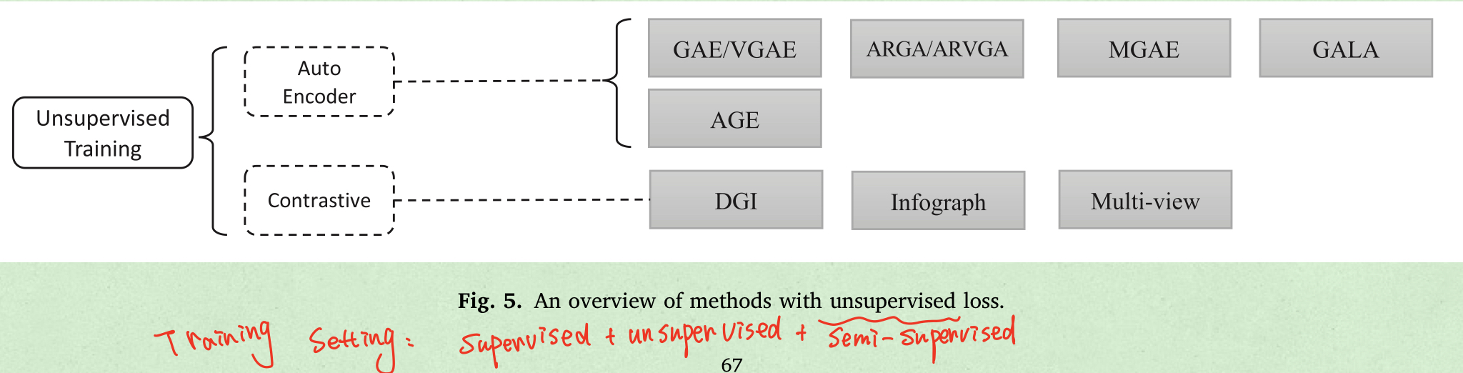 从监督的角度出发,图学习任务可以被分为三种训练设置:supervised setting(提供有标签数据)、semi-supervised setting(给定小部分的labeled数据,transductive setting:预测无标签数据的label,inductive setting:从相同的分布中推断出新的unlabeled数据。最多的节点和边分类的任务都是属于半监督学习。)unsupervised setting(只提供了unlabeled data,节点聚类是一种典型的无监督setting)。
