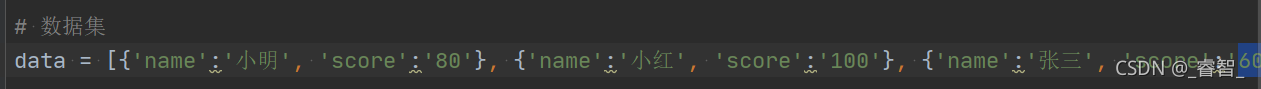 data = [{'name':'小明', 'score':80}, {'name':'小红', 'score':100}, {'name':'张三', 'score':60}]