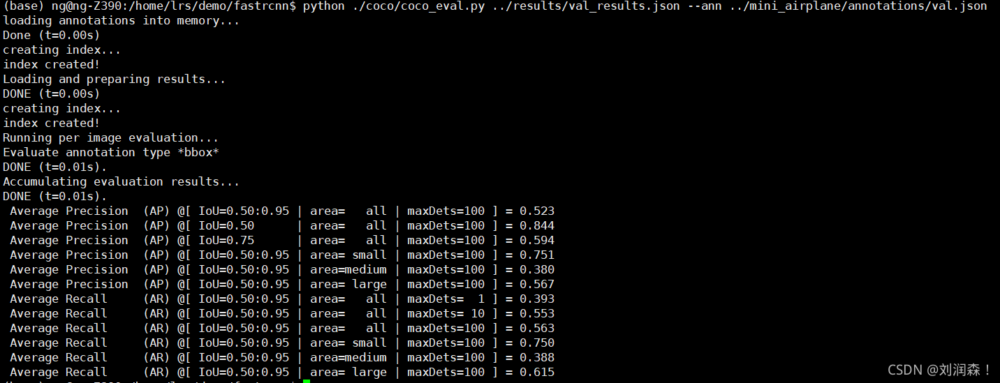(base) ng@ng-Z390:/home/lrs/demo/fastrcnn$ python ./coco/coco_eval.py ../results/val_results.json --ann ../mini_airplane/annotations/val.json