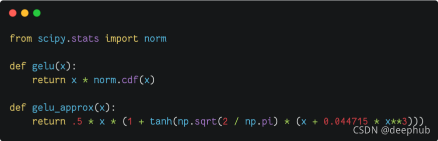 Gaussian Error Linear Unit (GELU) 是 Hendrycks & Gimpel 在 2016 年的一篇论文中提出的。 该函数只是将其输入与此输入处的正态分布的累积密度函数相乘。 由于此计算非常慢,因此在实践中经常使用更快的近似值,仅在小数点后第四位有所不同。