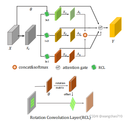 FSM 用于自适应地聚合提取不同的核大小、形状和方向的信息。RCL是原始的卷积核,在通过额外conv层学到的参数θ,把之前标准的卷积核变成带有参数θ的旋转卷积核,得到offset,共享输入的特征图,然后输入特征图与offset共同作为旋转卷积层的输入。