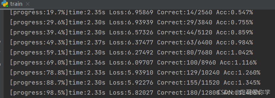 print("[progress:{:.1f}%]time:{:.2f}s Loss:{:.5f} Correct:{}/{} Acc:{:.3f}%".format(