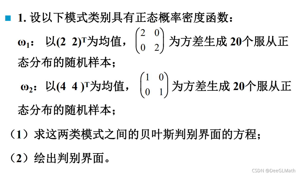 σ12?=2,σ22?=1μ1?=[2,2]T,μ2?=[4,4]TP(w1?)=P(w2?)=21?d=2∣Σ1?∣=4,∣Σ2?∣=1