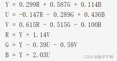 ? ? ? ? YUV模型是电视信号系统所采用的颜色编码方式。这三个变量分别表示像素的亮度(Y)、红色分量与亮度信号差值(U)、蓝色与亮度的差值(V)。这种颜色模型主要用于视频和图像的传输。RGB模型与YUV模型之间的转换关系如下: