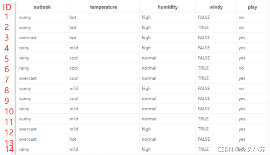 ? 根据这个思想,我们举一个实例来说明。下表为根据outlook,temperature,humidity,