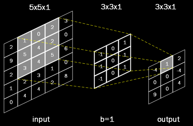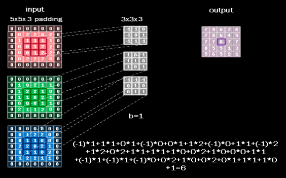 卷积计算方法和单层卷积核相似,卷积核为了匹配红绿蓝三个颜色,把三层的卷积核套在三层的彩色图片上,重合的 27 个像素进行对应点的乘加运算,最后的结果再加上偏置项 b,求得输出图片中的一个值。
