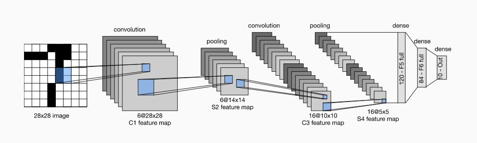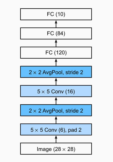 LeNet(LeNet-5)由两个部分组成: * 卷积编码器:由两个卷积层组成; * 全连接层密集块:由三个全连接层组成。