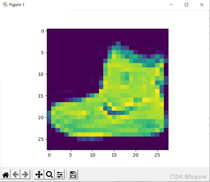 发现显示出一个9,fashion_mnist中使用整形数据表示标签,我们这里的9代表鞋子,我们的label的取值范围为[0,9]一共十分类