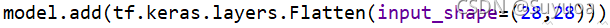我们之前使用的层只有dense层,那个是处理一维数据的,现在我们的输入是(28,28),这个是个二维数据,所以我们第一层要使用Flatten(扁平层),这一层的目的是将其变成28*28的向量,这样我们这一层的结果就变为了1维数据,后面就能使用dense了
