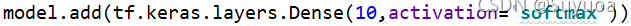 这一层是输出层,由于我们是10分类所以我们在这里写10,如果是6分类就写6,后面的激活函数是softmax,只要是分类问题(不管是10分类还是6分类)就一定要用softmax,上一章我们提到了二分类,二分类用sigmod(当然2分类用softmax也不会报错,就是效果不好)