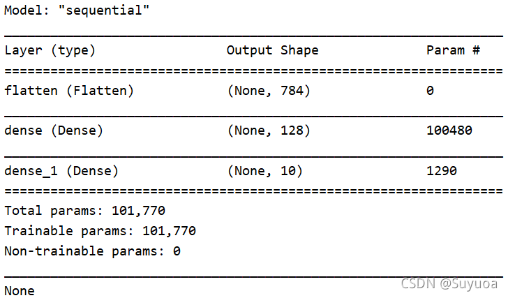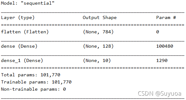我们可以看到Flatten这层是没有参数的,在这里只对数据进行转换 784 = 28 * 28 ,下一层dense层 100480 = 784 * 128 + 128