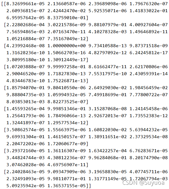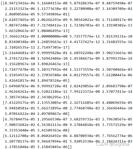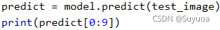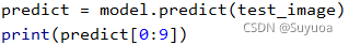 这个是未经过处理的预测结果,结果中会包含10个值,这个值可以理解为每个分类的可能性,一般来讲,我们会选取10个值中的最大值然后获取其索引从而得到最终的结果