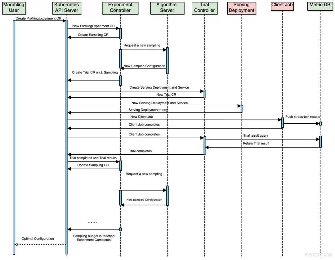 - 对于每个参数调优作业 experiment,Morphling 定义了另一层抽象:trial。Trial 封装了针对某一特定参数组合的一次性能测试流程,涵盖了底层的 Kubernetes 容器操作:每个 trial 中,Morphling 根据测试参数组合,配置并启动推理服务容器,检测服务的可用性和健康状态,并对服务进行压力测试,测量该配置下容器的服务性能,例如响应时间延迟、服务吞吐量、资源使用效率等。测试结果将存储在数据库中,并反馈给 experiment。