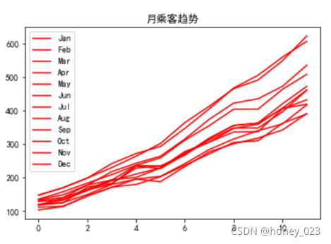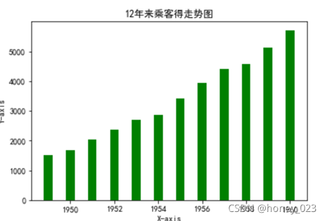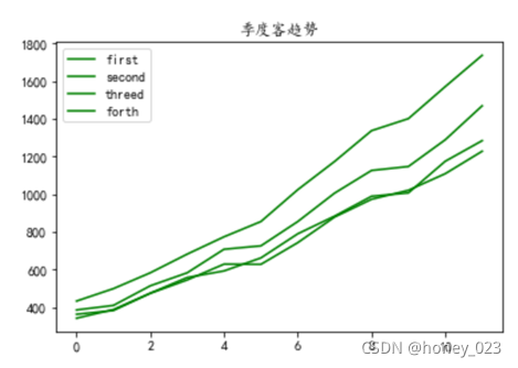 求出每个月总和 data.loc["每个月总和"]=data.sum()  6.画出乘客年走势图,月走势图,季度走势图 #12年乘客走势条形图 fig = plt.figure() plt.bar(x,y,0.4,color="green") plt.xlabel("X-axis") plt.ylabel("Y-axis") plt.title("12年来乘客得走势图") plt.show() ?  乘客月走势图 plt.savefig("barChart.jpg")? y.plot(kind='line',marker='',color='r',title='月乘客趋势')?  ?季度走势图 Y.loc[:,'first']= Y.loc[:,'Jan'] + Y.loc[:,'Feb']+Y.loc[:,'Mar'] Y.loc[:,'second']= Y.loc[:,'Apr'] + Y.loc[:,'May']+Y.loc[:,'Jun'] Y.loc[:,'threed']= Y.loc[:,'Jul'] + Y.loc[:,'Aug']+Y.loc[:,'Sep'] Y.loc[:,'forth']= Y.loc[:,'Oct'] + Y.loc[:,'Nov']+Y.loc[:,'Dec'] jd.plot(kind='line',marker='',color='g',title='季度客趋势')  现在就是做到这里,感觉自己用的都是些小学生的处理方式呀! ? |
