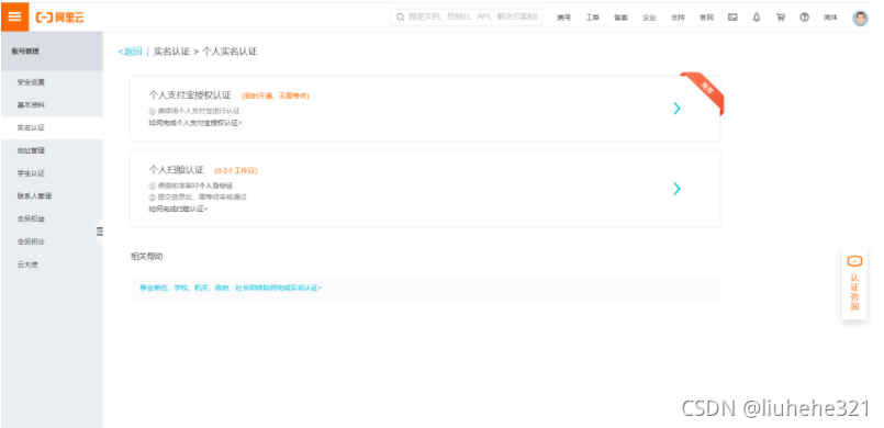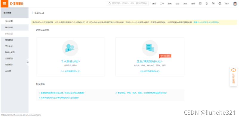 如果是个人推荐“个人实名认证”,如果是企业推荐“企业/政府实名认证”。这里选择个人实名认证。
