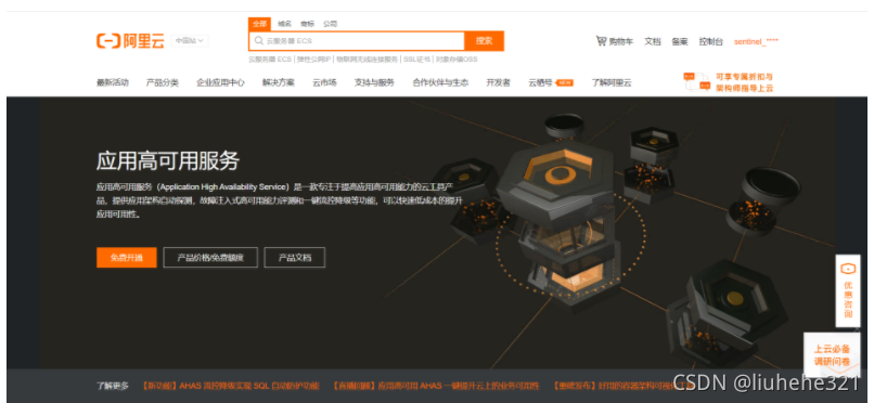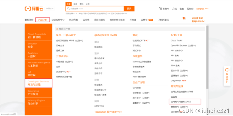 在阿里云中找到“产品分类”中的"开发与运维"中的”应用高可用服务AHAS“选项
