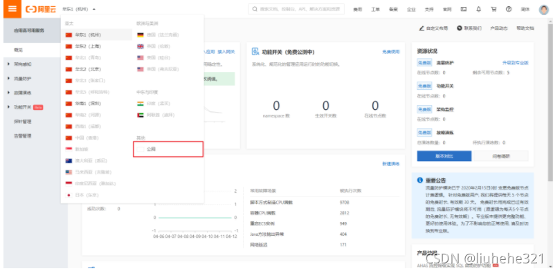 在控制台顶部的地域列表中,选择地域为公网 。