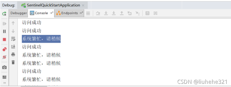 之后,在浏览器输入http://localhost:8080/zookeeper,慢速刷新,则持续显示”Hello Sentinel”;快速刷新则会交替出现”Hello Sentinel!”和“系统繁忙,请稍候”。这说明对资源限流成功。