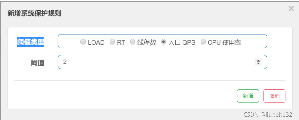 在Sentinel控制台的左侧菜单中选择“系统规则”,点击“新增系统规则”按钮,设置系统自适应保护规则,其中阈值类型选择“入口QPS”。
