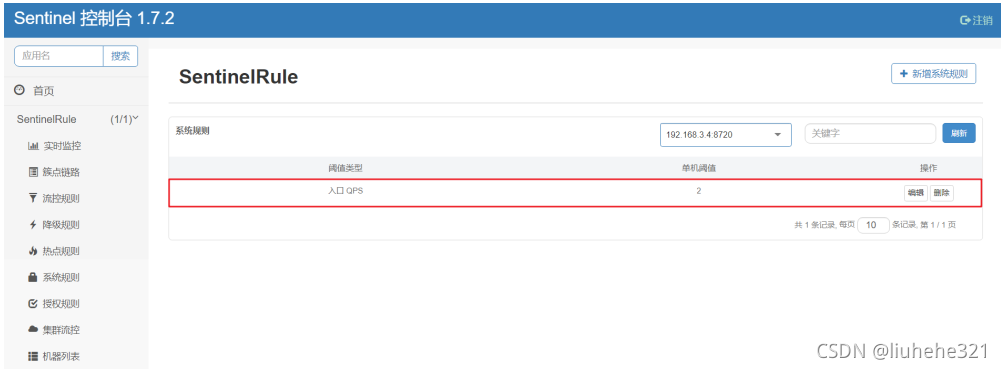 将SysController中的代码设置系统自适应保护规则删除,重启项目,在Sentinel控制台动态设置系统自适应保护规则。