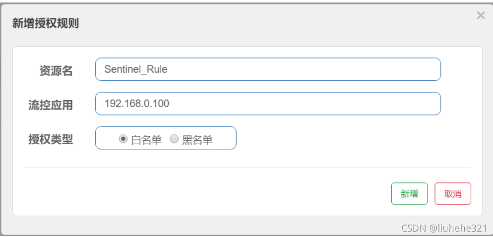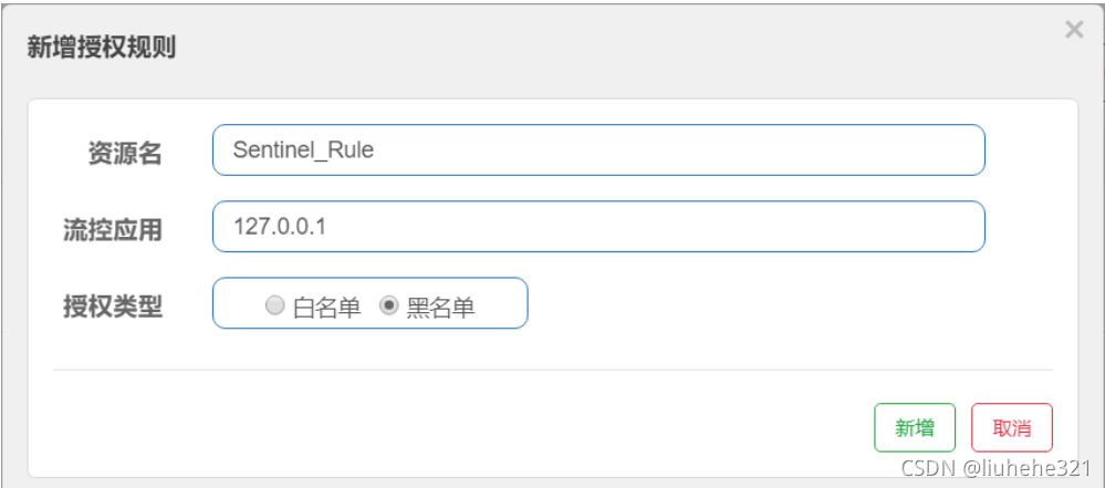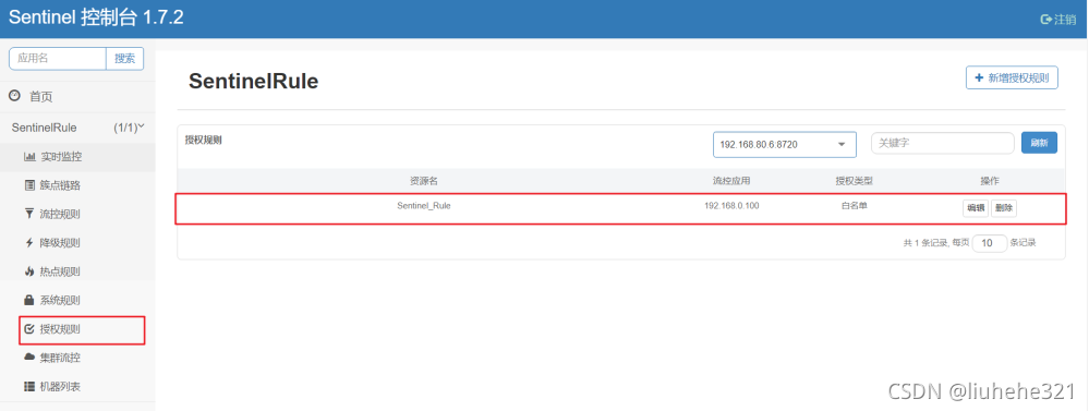 在Sentinel控制台的左侧菜单中选择“授权规则”,点击“新增授权规则”按钮,增加白名单或者黑名单。