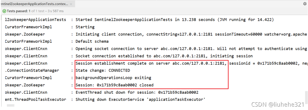 ? ?@Test ? ?public void contextLoads() throws Exception { ? ? ? ?//zookeeper的服务端连接地址 ? ? ? ?final String remoteAddress = "127.0.0.1:2181";