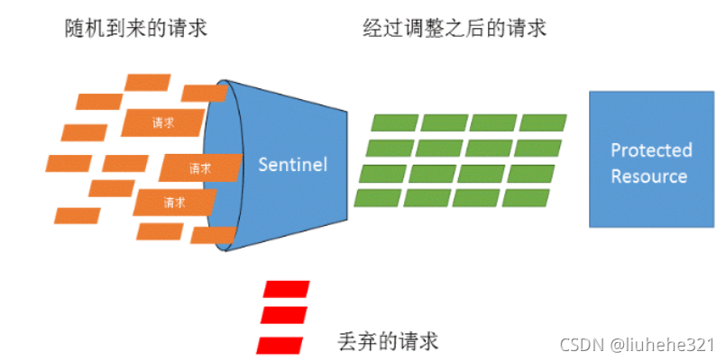 流量控制在网络传输中是一个常用的概念,它用于调整网络包的发送数据。然而,从系统稳定性角度考虑,在处理请求的速度上,也有非常多的讲究。任意时间到来的请求往往是随机不可控的,而系统的处理能力是有限的。我们需要根据系统的处理能力对流量进行控制。Sentinel 作为一个调配器,可以根据需要把随机的请求调整成合适的形状,如下图所示: