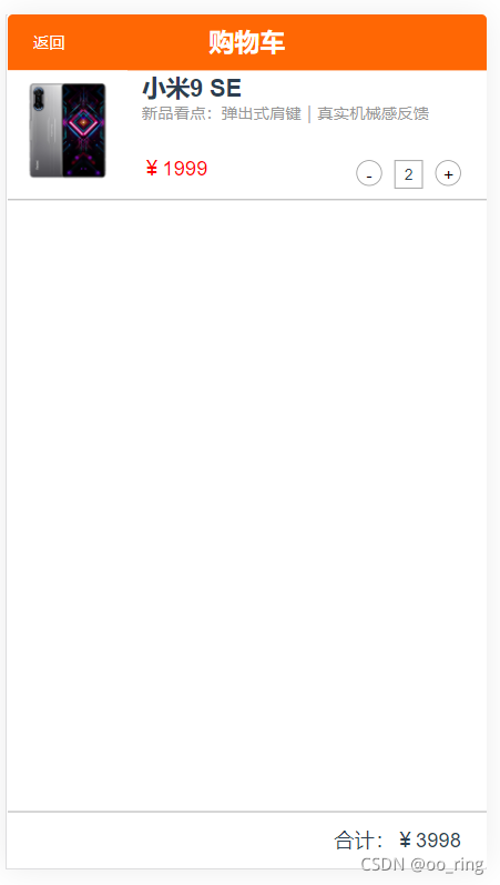 点击购物车会跳转到购物车页面,里面有两个我们刚刚加入的商品?,价格也是直接算好。还有加减数量