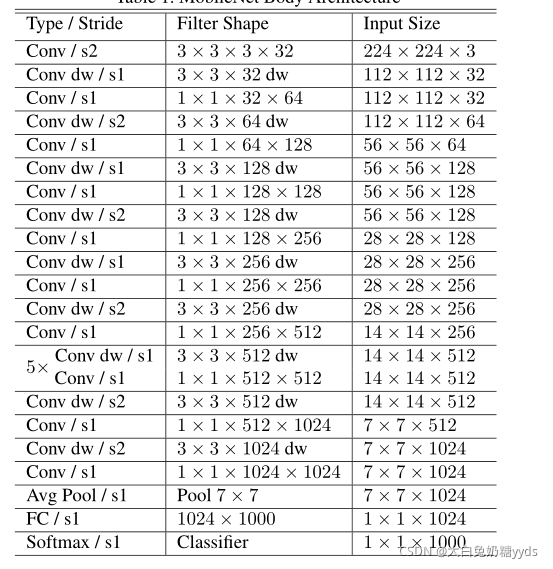 (4)降低网络成本的超参数:宽度倍增器(作用是在每一层均匀地薄化网络。对于给定的层和宽度乘数α,输入通道数M变为αM,输出通道数N变为αN)、分辨率乘数ρ(将其应用于输入图像,随后每个层的内部表示将通过相同的乘数进行缩减),两个超参数的影响后的成本DK·DK·αM·ρDF·ρDF+αM·αN·ρDF·ρDF