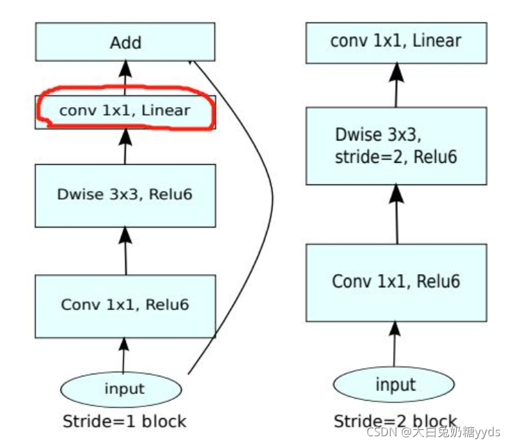 (2)改动:MobileNet V2 先用1x1卷积提升通道数,然后用Depthwise 3x3的卷积,再使用1x1的卷积降维;Depthwise输出比较浅,应用ReLU会带来信息损失,所以在最后把ReLU去掉了。