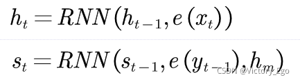 ? ? ? ? 序列到序列模型一般采用两个RNN分别作为编码器和解码器。在编码器和解码器的每个时间步t,编码状态和解码状态的隐状态表示为: