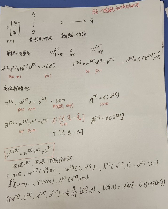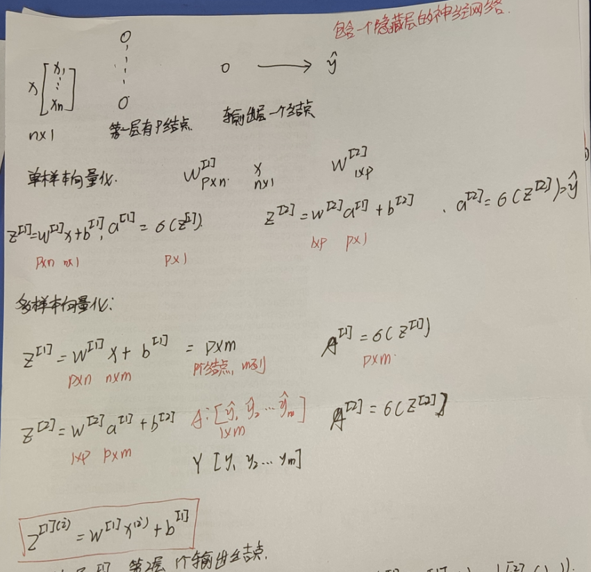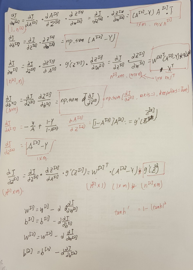 X大小为(n_x,m),W1大小为(n_h_1,n_x),b_1大小为(n_h,1),Z1大小为(n_h_1,m),A1同Z1 W2大小为(n_y,n_h_1),b_2大小为(n_y,1),Z2大小为(n_y,m),A2同Z1同Y