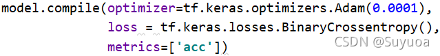 我们的所有loss存放在tf.keras.losses中,上面我们用的是大写的BinaryCrossentropy,这个和咱们之前直接输入字符串的效果相同,还有一种小写的,这个需要添加参数,我们现在暂时不用这个