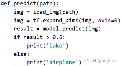 我们发现得到了一个概率值,这个值越靠近1就是越像湖泊,越靠近0就越像飞机,那我们现在就可以直接进行判断了
