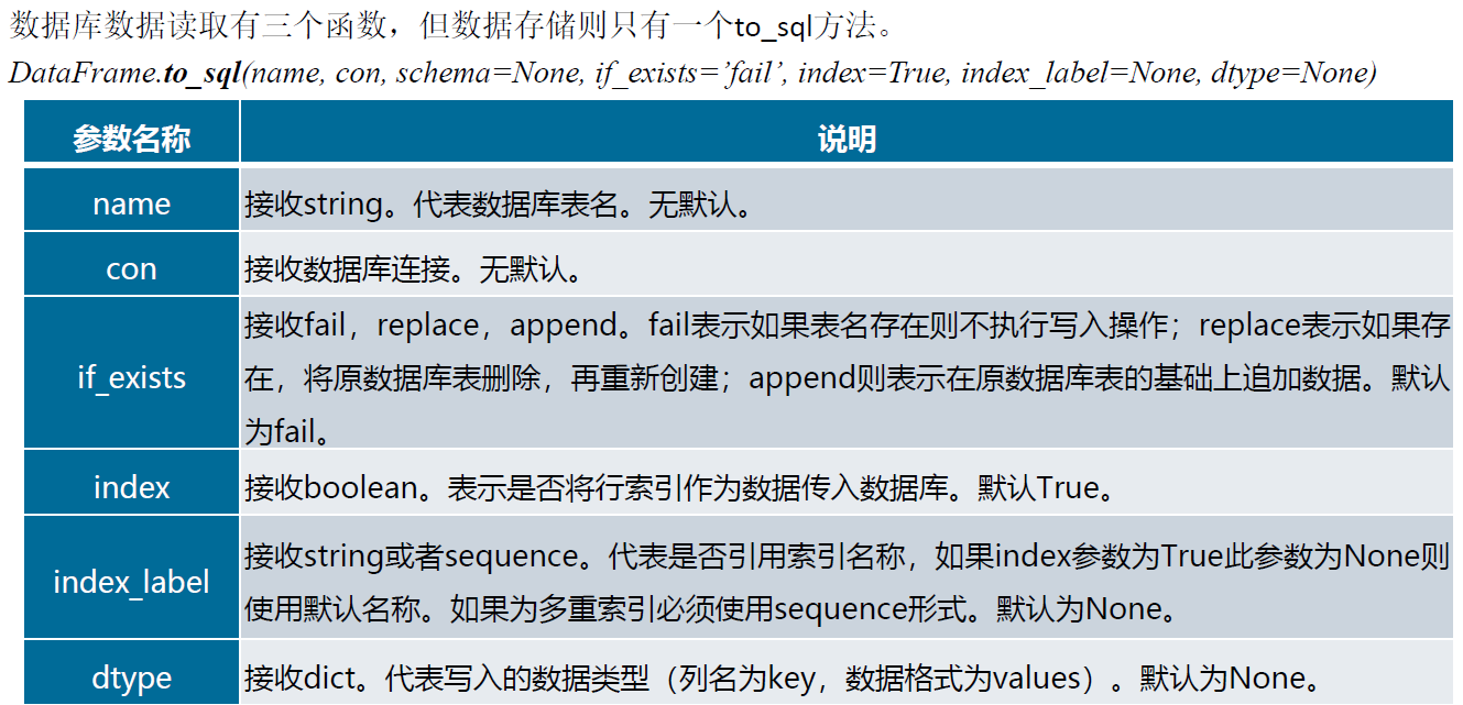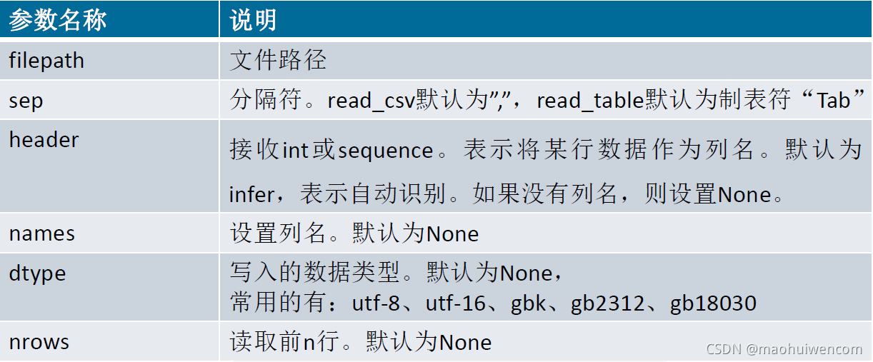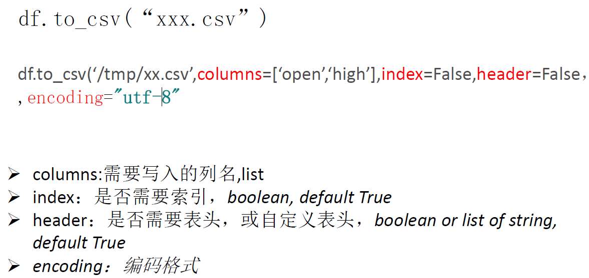 ③.read_csv和read_table常用参数及说明  ④.写入文件to_csv  ⑤.写入到to_excel 将文件存储为Excel文件,可以使用to_excel方法。其语法格式如下。 DataFrame.to_excel(excel_writer=None, sheetname=None’, na_rep=”, header=True, index=True, index_label=None, mode=’w’, encoding=None)