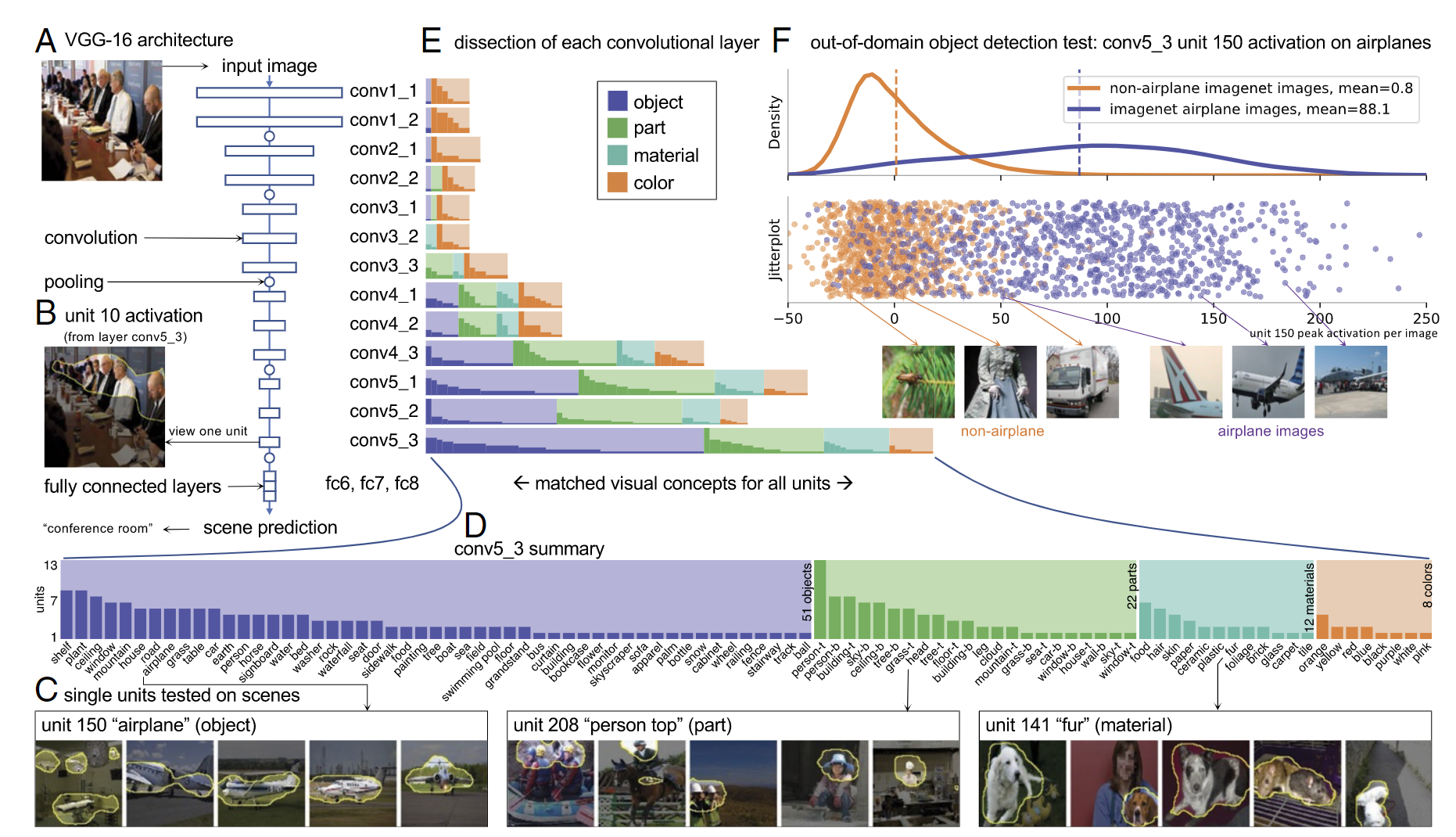 F图:将conv5_3的单元150作为飞机的检测器,用ImageNet中的图像进行实验,F图显示了飞机和非飞机对象的样本通过单元150输出的激活统计,在jitter图上,横轴代表通过单元150后输出的得分(激活程度),jitter图上面的是概率密度图,体现了样本的概率分布;可以看出单元150确实能很清晰地将飞机样本与非飞机样本划分开(单元150对于飞机样本输出地平均激活值为88.1,对于非飞机样本输出地平均激活值为0.8)