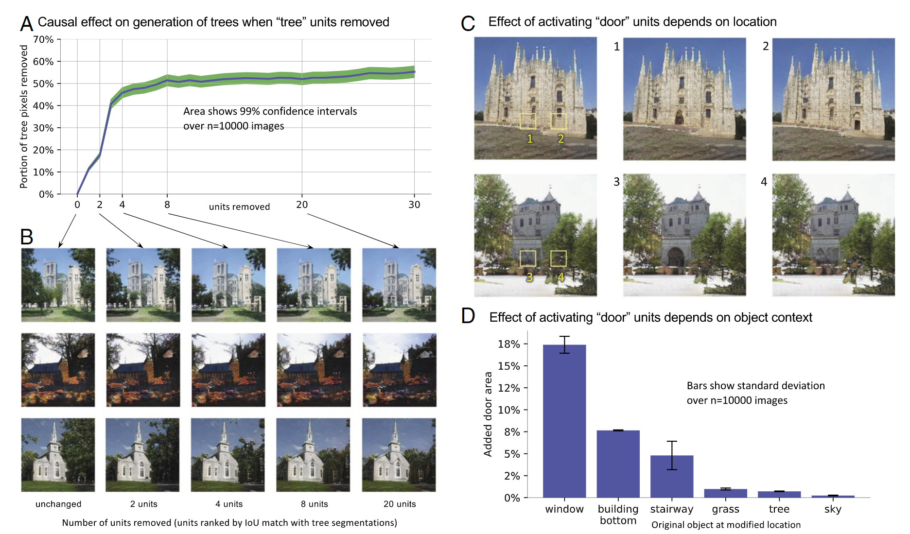 图 A 和 B:移除跟生成tree相关的unit,移除 Tree 的 unit 越多,树的数量越少;
