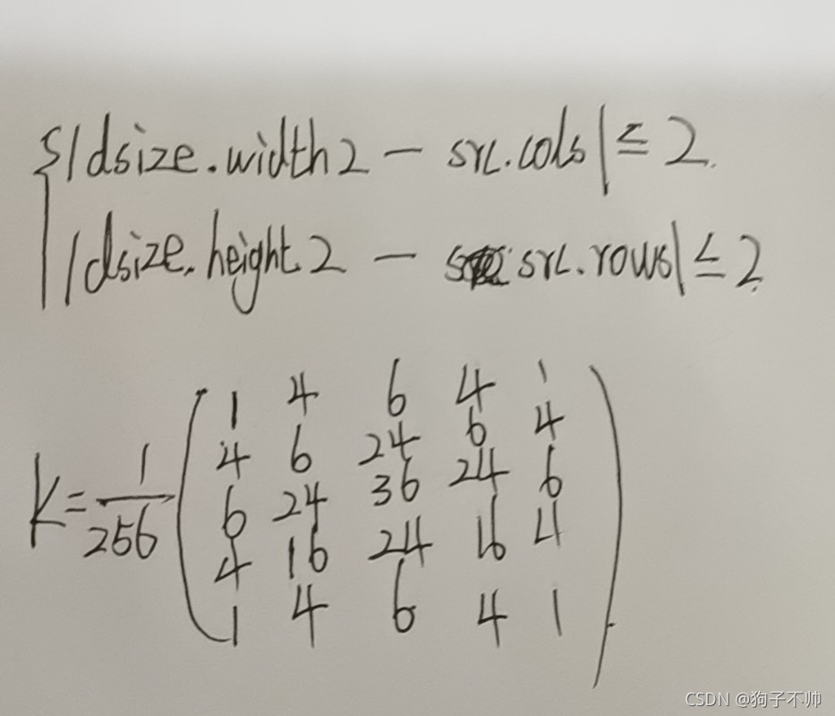 ? ? ? ? 该函数实现图像模糊并对其进行下采样,我们可以通过dsize参数来设置输出图像的大小,无论尺寸多大都满足下式。该函数首先将原始图像与内核矩阵进行卷积,内核矩阵如下,之后通过不使用偶数行和列的方式对图像进行下采样。