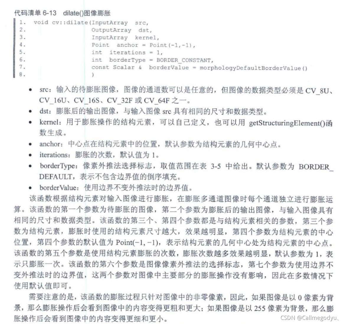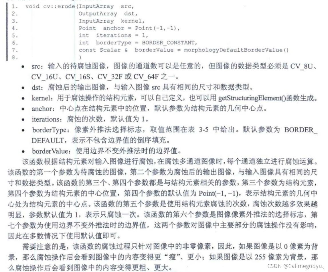 该函数的腐蚀过程只针对图像中的非零像素 因此,如果图像是以 255像素为背 景,那么腐蚀操作后会看到图像中的内容变得更"瘦 、更小 :如果图像是以0?像素为背景,那么腐蚀操作后会看到图像中的内容变得更租、更大,与腐蚀相反。