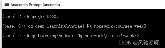 ?然后打开Anaconda Prompt,进入到course4-week3文件下(每个人的文件地址不一样,需要适当修改,下面进入文件夹命令作为参考),命令如下: